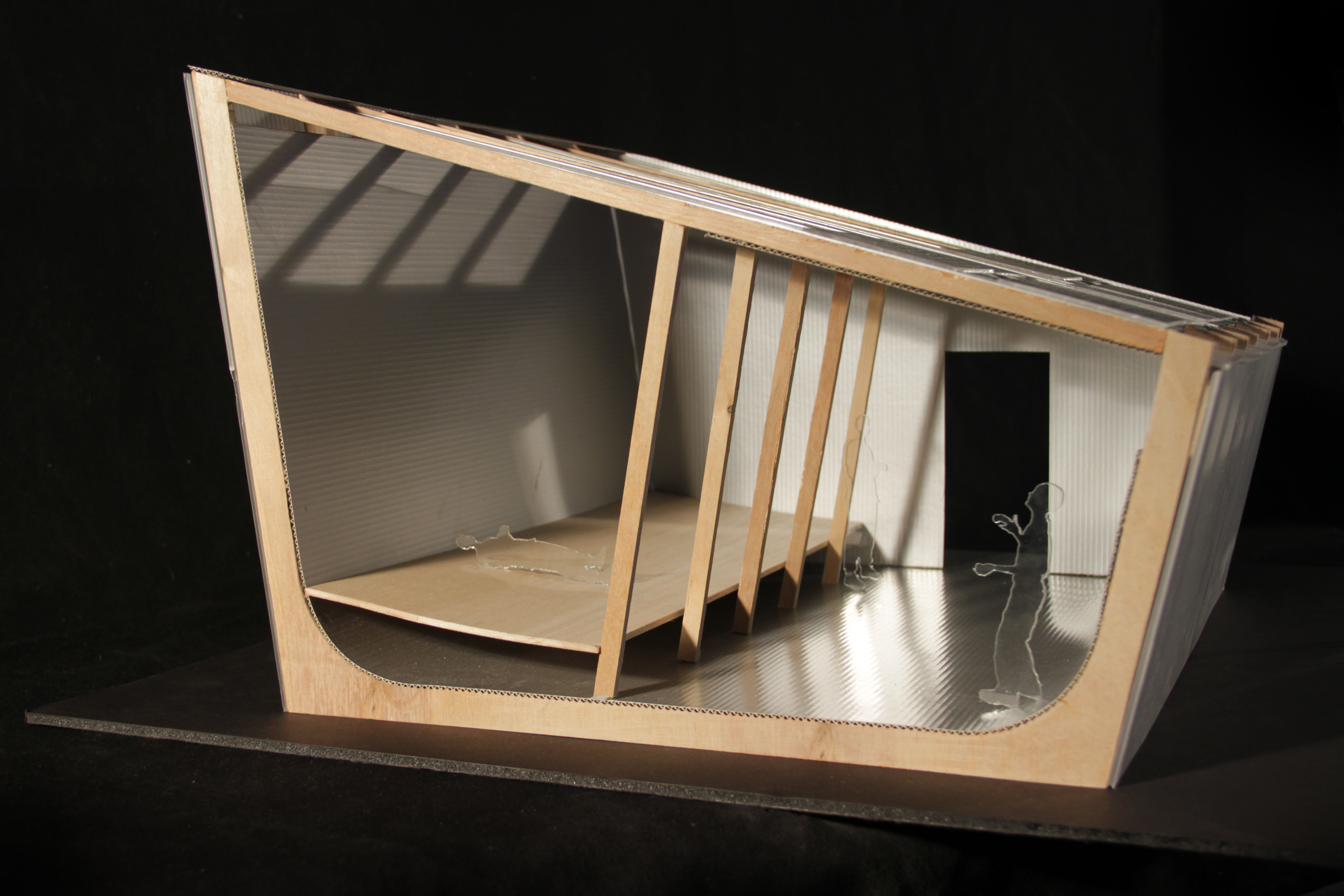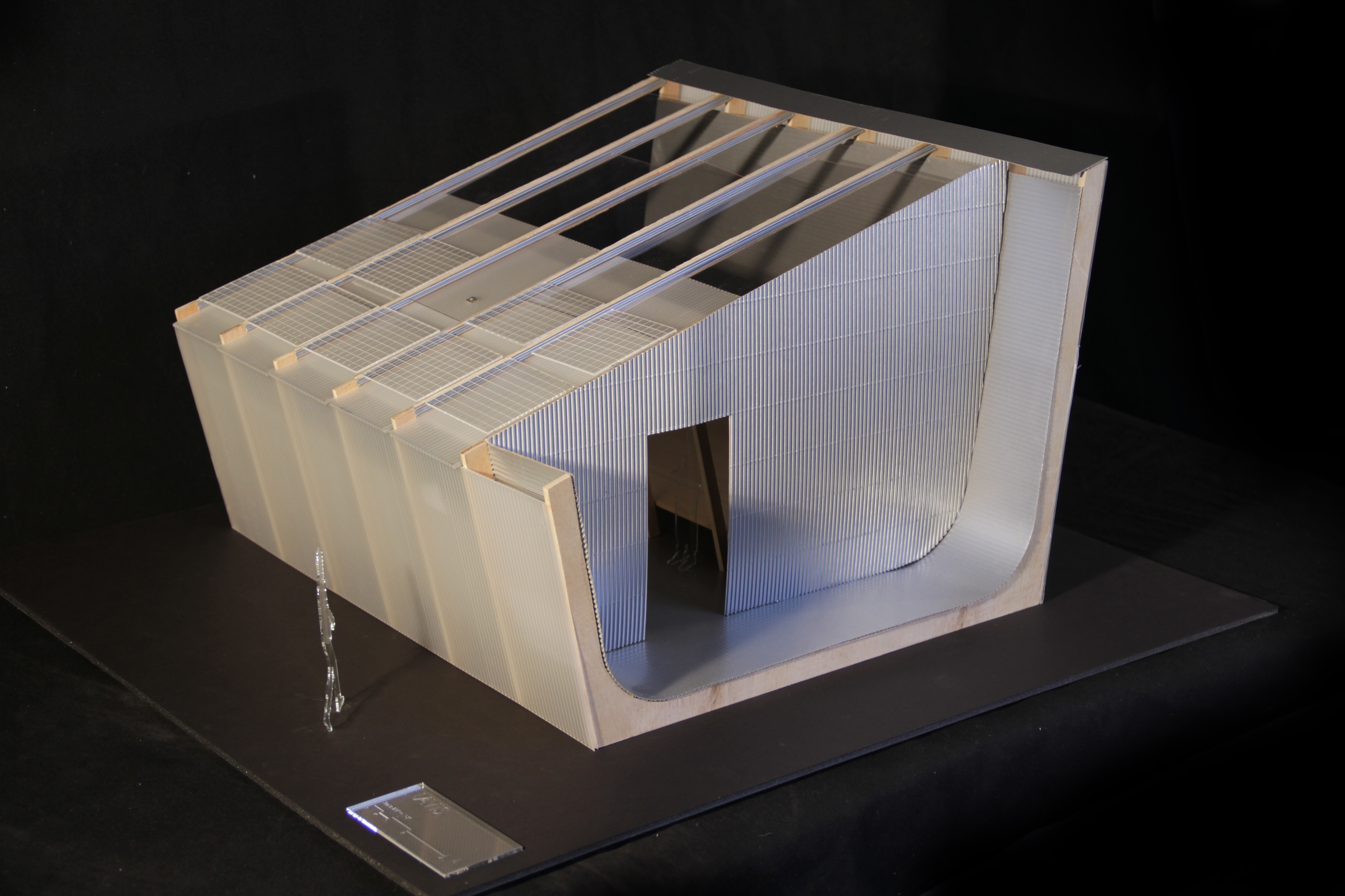 Enhancing a sense of continuity, and constant awareness of being in a vessel. A single plane swoops from the entrance of the universe to its exit. The plane forms the space, acting as a floor system, an enclosure system and a structural system.